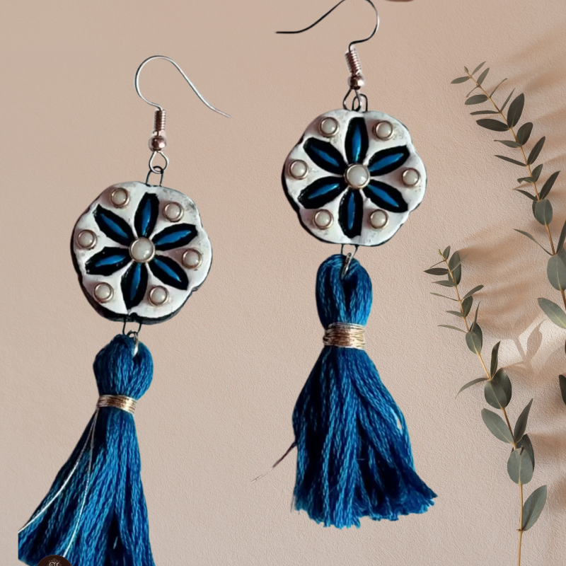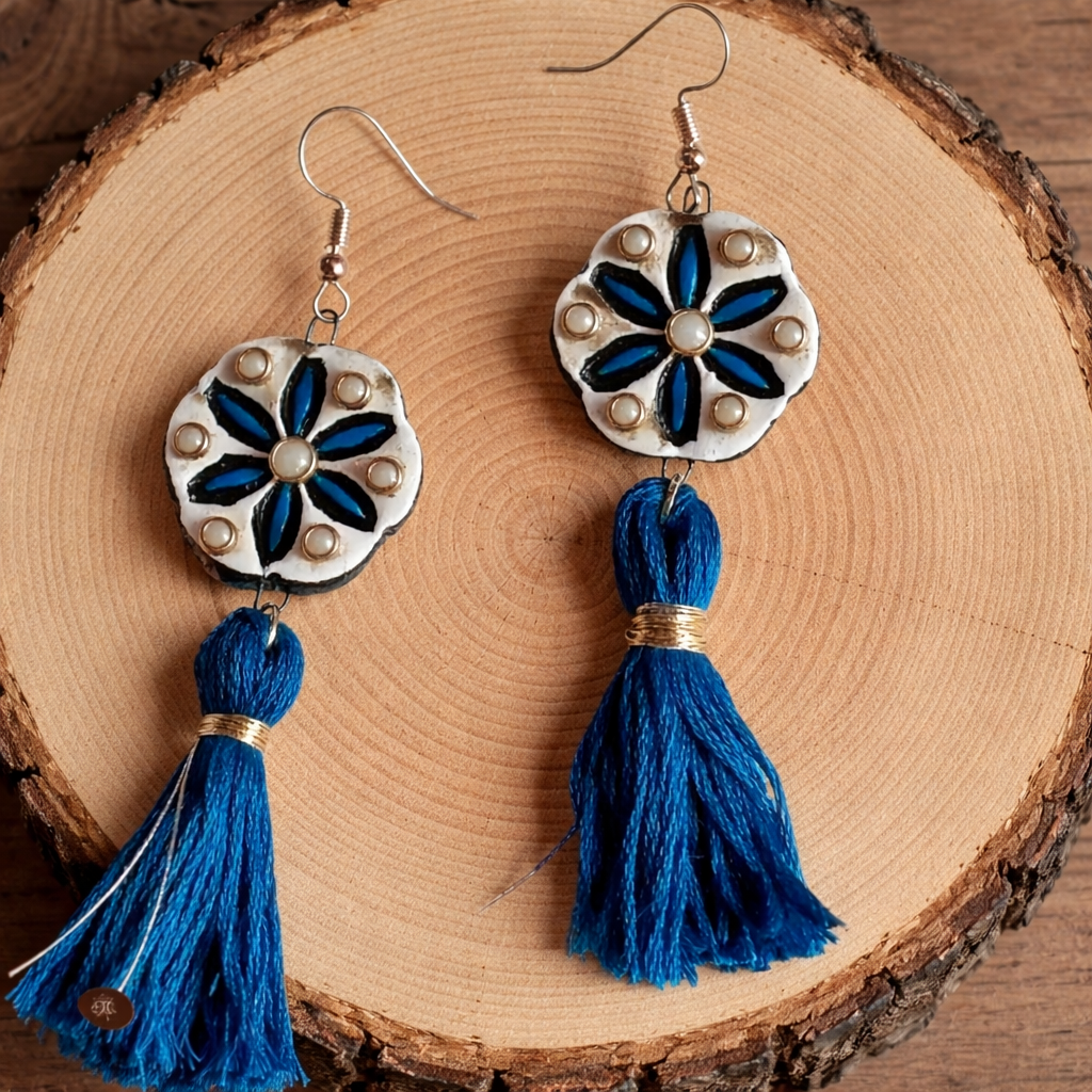 Terracotta Dangle Earrings with Cobalt Blue Tassels and pearl white kundan stones